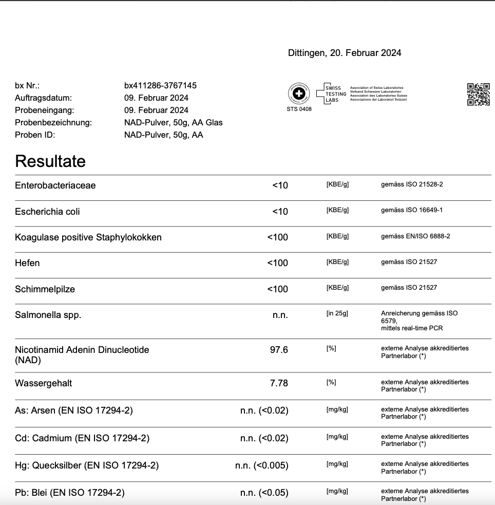 In dem hier abgebildeten aktuellen Analysebericht über das von uns vertriebene NAD+ sehen Sie im Abschnitt über die mikrobiologische Analayse Angaben < 10 und < 100.
